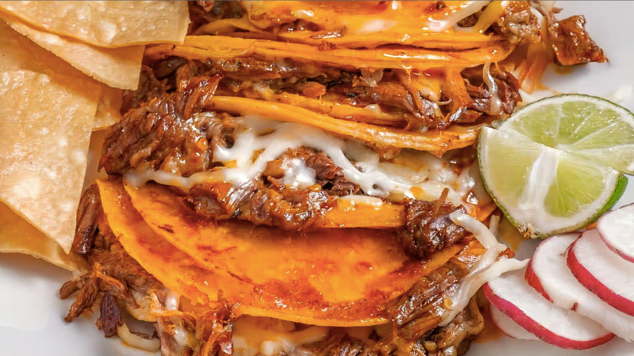 Three quesabirria filled with onion, cilantro.