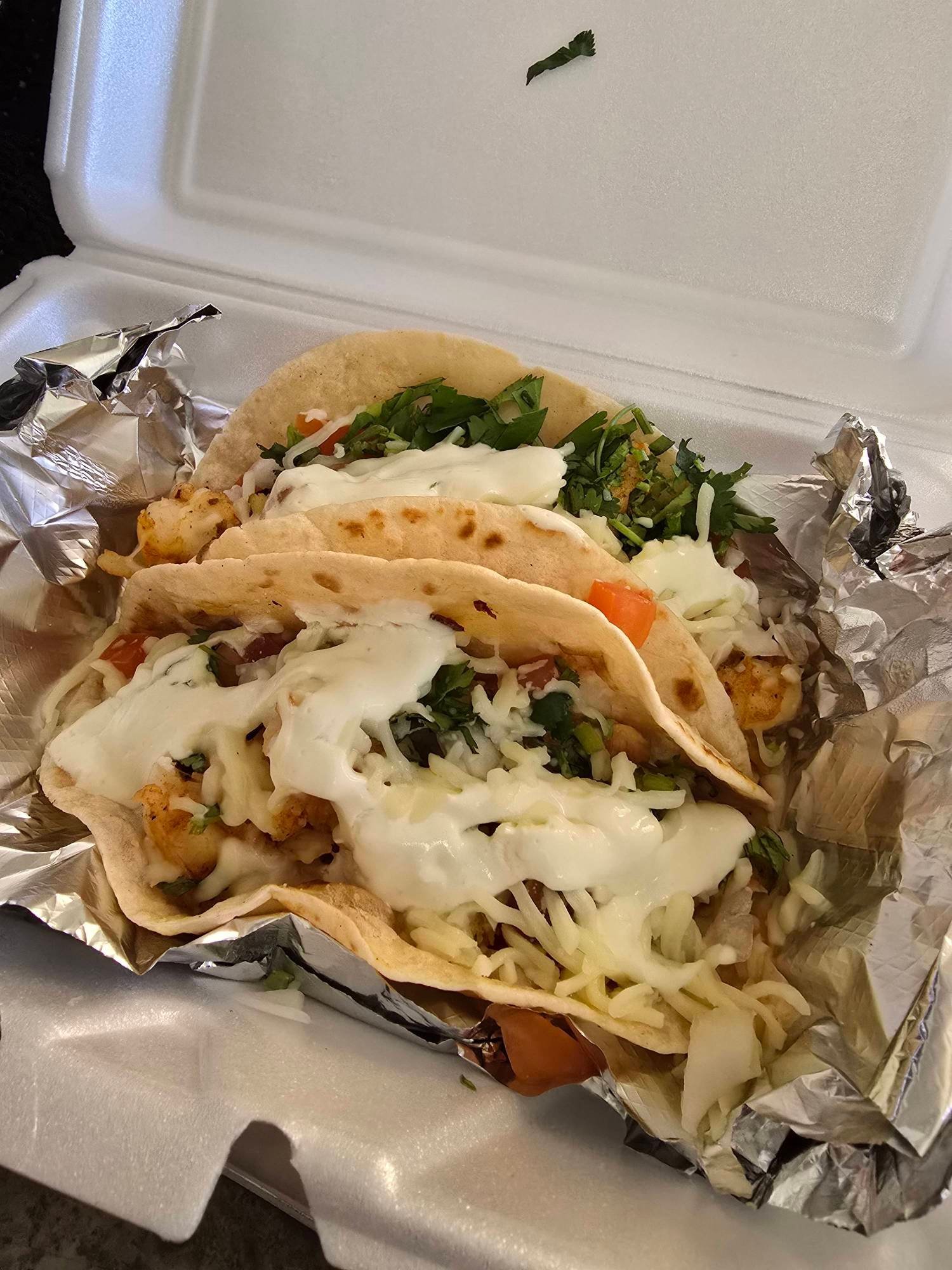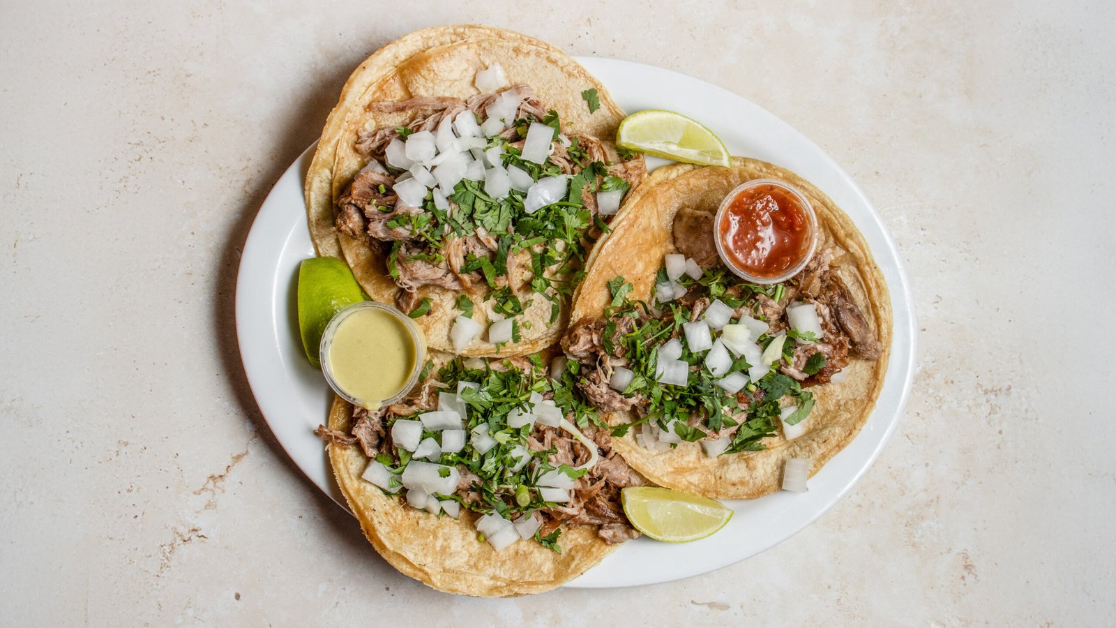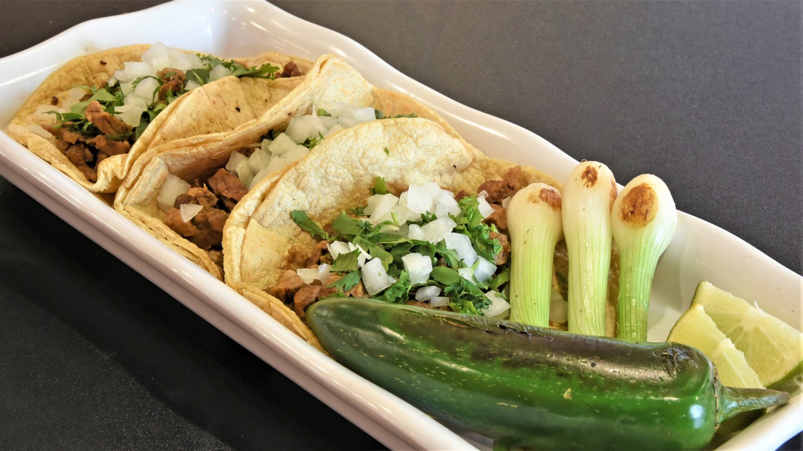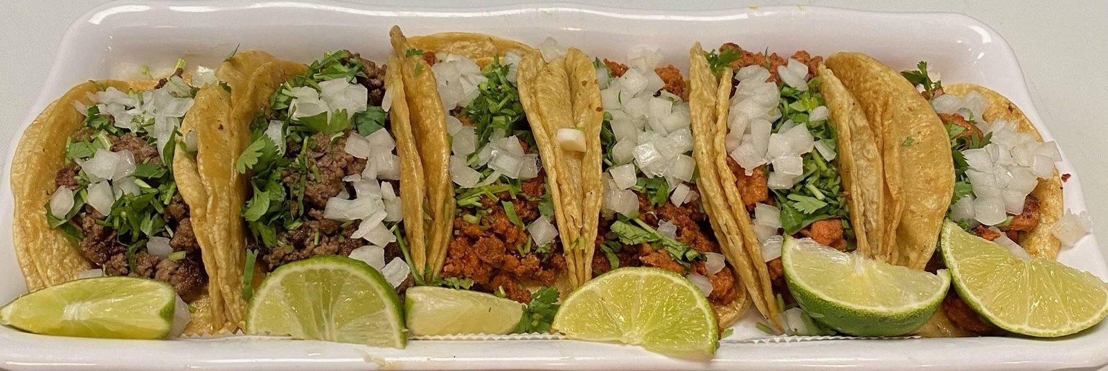 Taco with choice of corn or flour tortilla. Toppings include onion, cilantro, lettuce, tomato, cheese, and sour cream. Five salsa options: mild, hot, diablo xxx, and green guac.