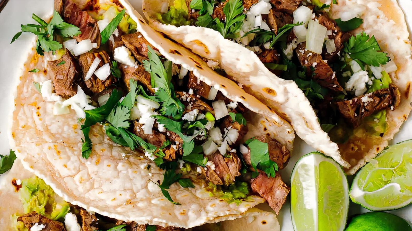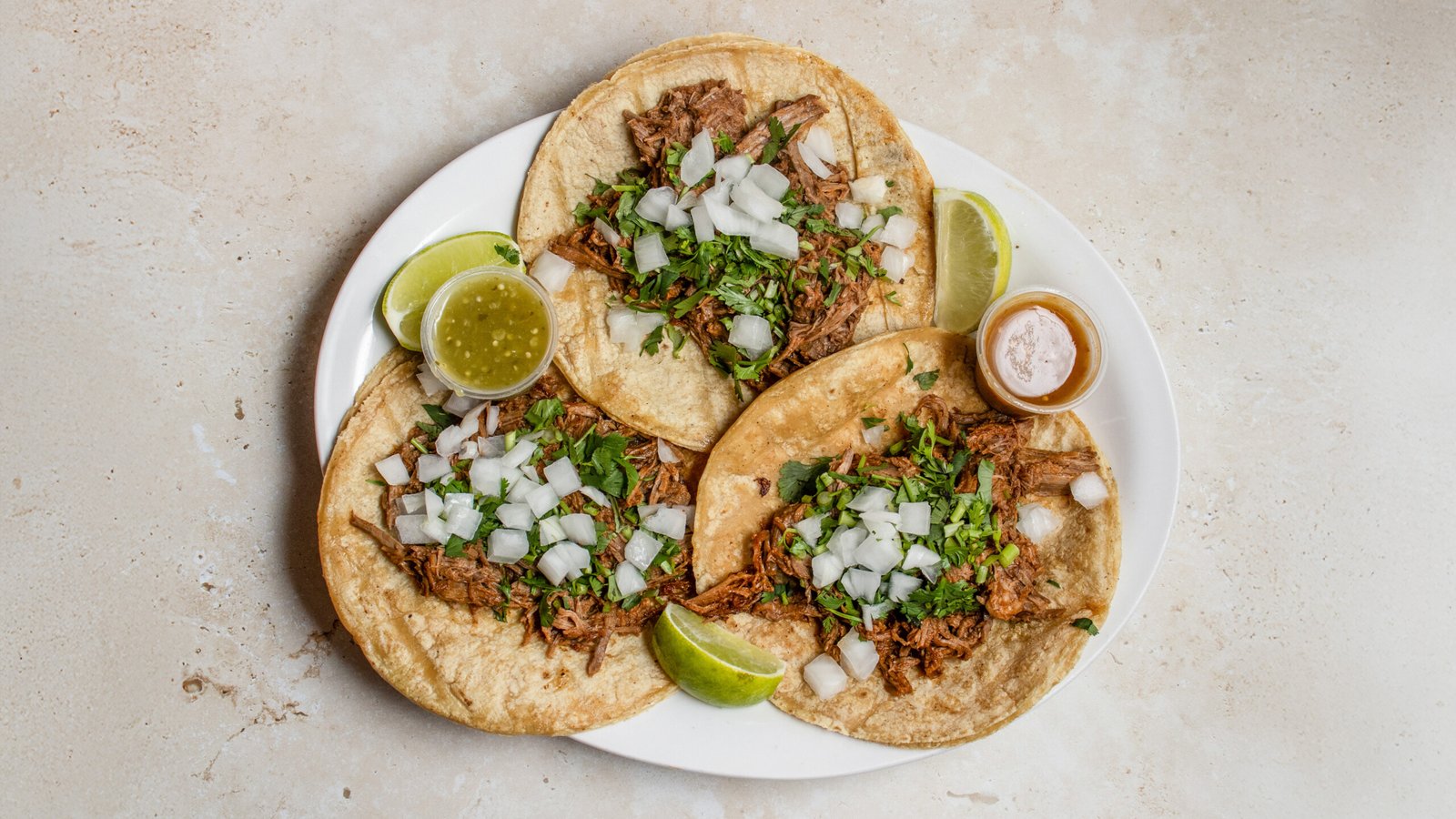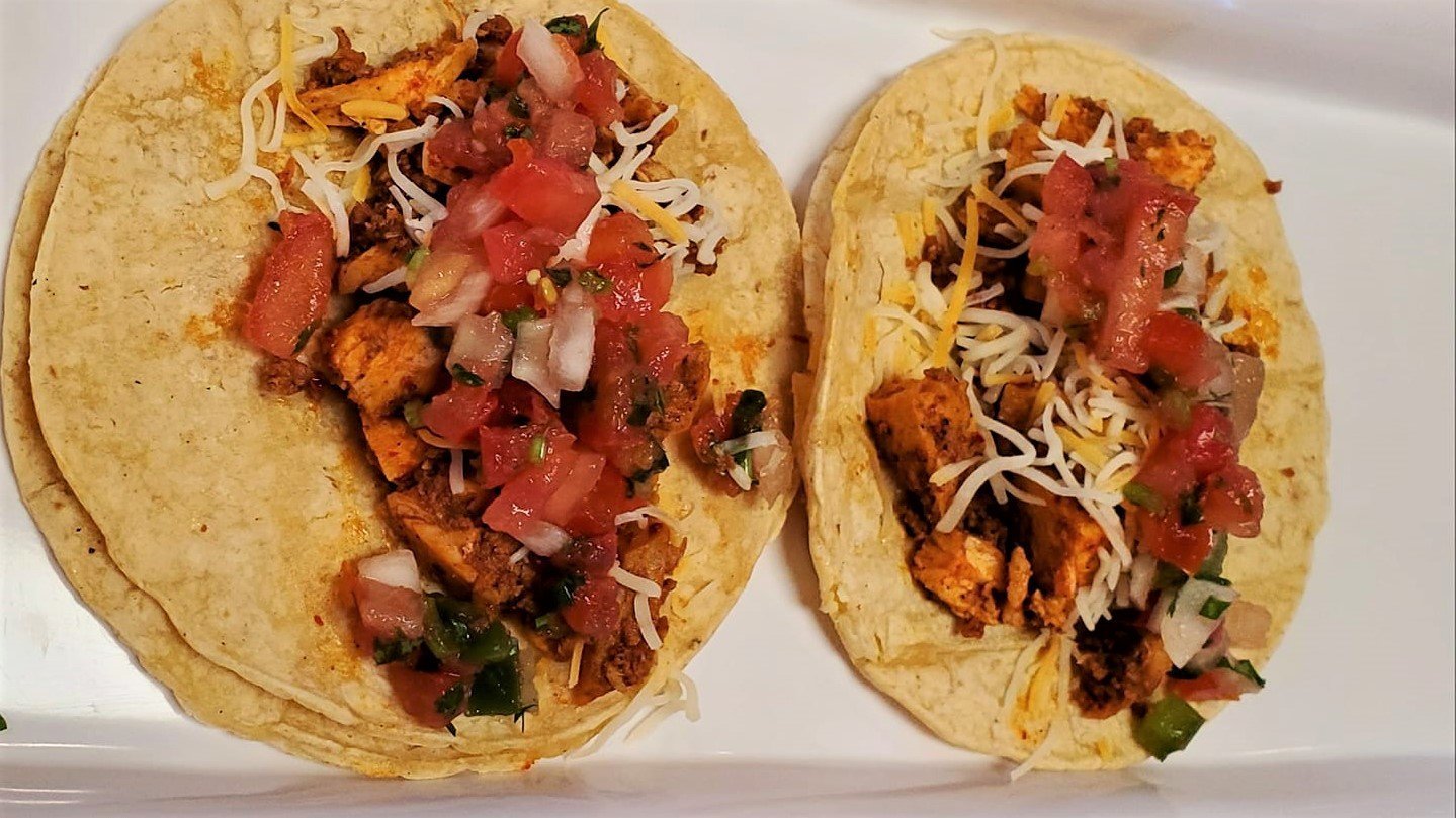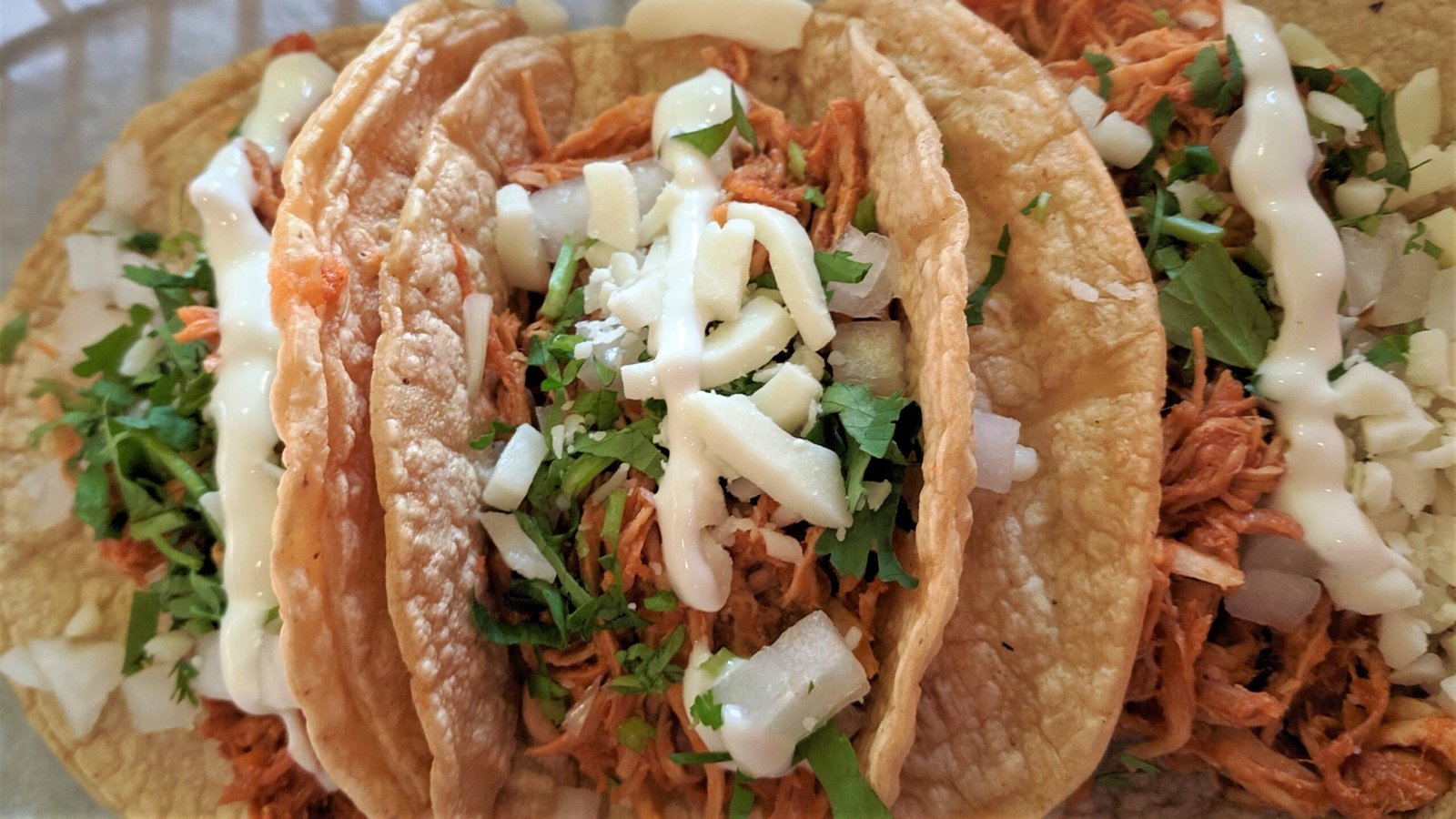Taco with choice of corn or flour tortilla. Toppings include onion, cilantro, lettuce, tomato, cheese, and sour cream. Five salsa options: mild, hot, diablo xxx, and green guac.