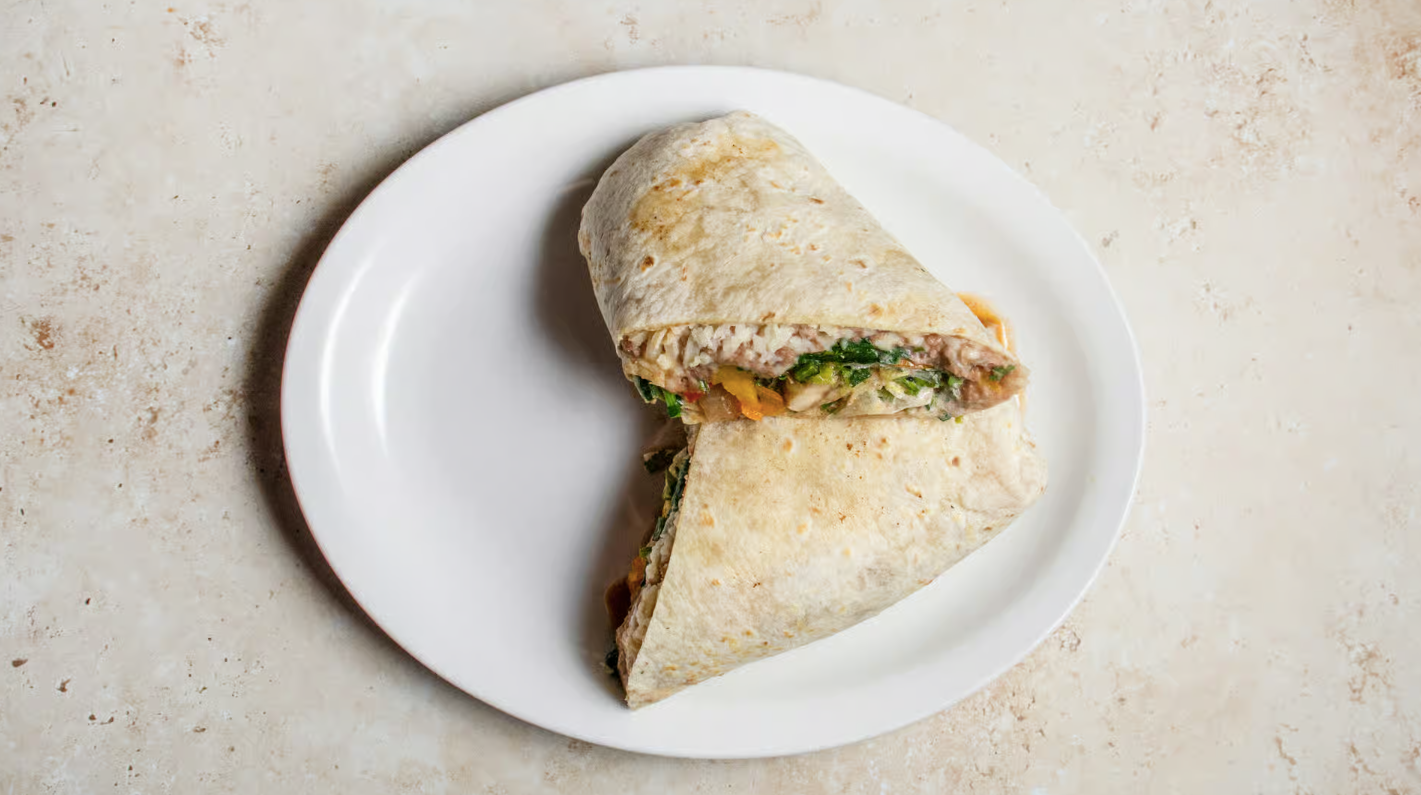 Includes. black or pinto beans, rice, guacamole, fajita veggies. along with your choice of fresh toppings. onion, cilantro, lettuce, tomato, cheese, sour cream, & salsa.